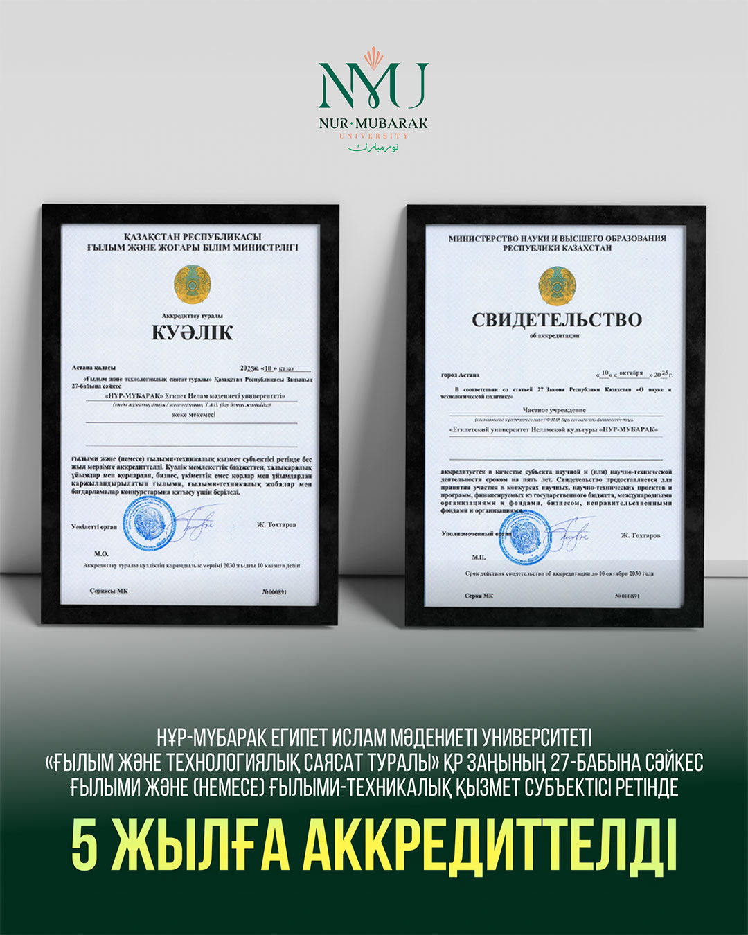 Нұр-Мүбарак университетінің PhD докторы, доцент м.а., жас ғалым АБДУЛХАКИМ БУРХАНАДИН ҚР Ғылым және жоғары білім министрі САЯСАТ НҰРБЕКТЕН «ЖАС ҒАЛЫМҒА ПӘТЕР» сертификатын иеленді Қазақстан Республикасының Президенті Қасым-Жомарт Тоқаевтың: «Ғылымды дамыту – еліміз үшін стратегиялық маңызы бар басымдық, әсіресе дарынды, қабілетті жастардың ғылыммен айналысуына жағдай жасау өте маңызды» – деген сөздері бүгінде нақты істермен жүзеге асырылуда. Осы игі бастаманың жарқын көрінісі ретінде Нұр-Мүбарак Египет ислам мәдениеті