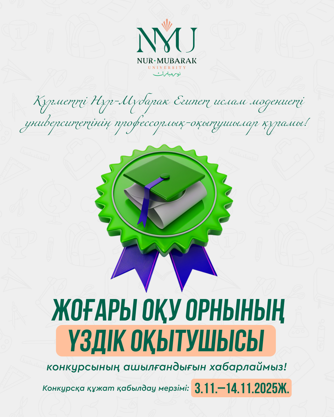 РЕСПУБЛИКА КҮНІНЕ ОРАЙ “ЗАҢ МЕН ҚҰҚЫҚ” ТАҚЫРЫБЫНДА АШЫҚ ДИКТАНТ ӨТКІЗІЛДІ Жоғары және жоғары оқу орнынан кейінгі білім комитетінен 15.10.2025 жылы келіп түскен № ТФ-34 хаттың негізінде және Республика күніне орай, 2025 жылдың 24 қазанында Нұр-Мүбарак Египет ислам мәдениеті университетінде Жалпы білім беру пәндері кафедрасының оқытушыларының ұйымдастыруымен 1 курс студенттерінің арасында “Заң мен құқық” тақырыбында ашық диктант өткізілді.Іс-шараның басты мақсаты – студенттердің құқықтық мәдениетін қалыптастыру, заңға