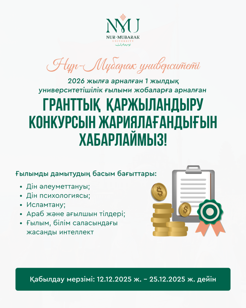 Нұр-Мүбарак университеті 2026 жылға арналған 1 жылдық университетішілік ғылыми жобаларға арналған гранттық қаржыландыру төмендегі Ғылымды дамытудың басым бағыттары бойынша конкурс жариялайды: