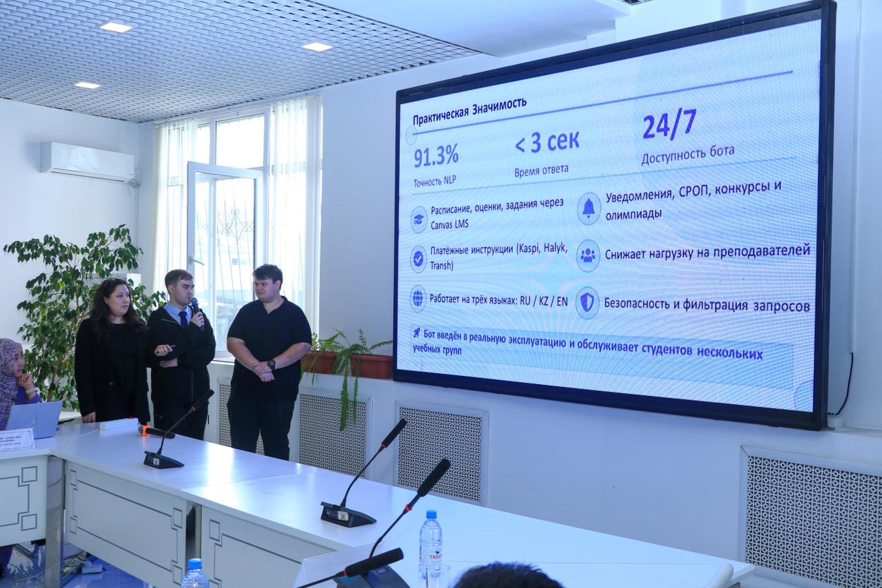 2-ші орын — Идрисова Руфина, Шмарин Тимофей, Савгира Андрей, Тұран университеті, жоба тақырыбы: Интеллектуальный диалоговый агент для онлайн-консультаций студентов