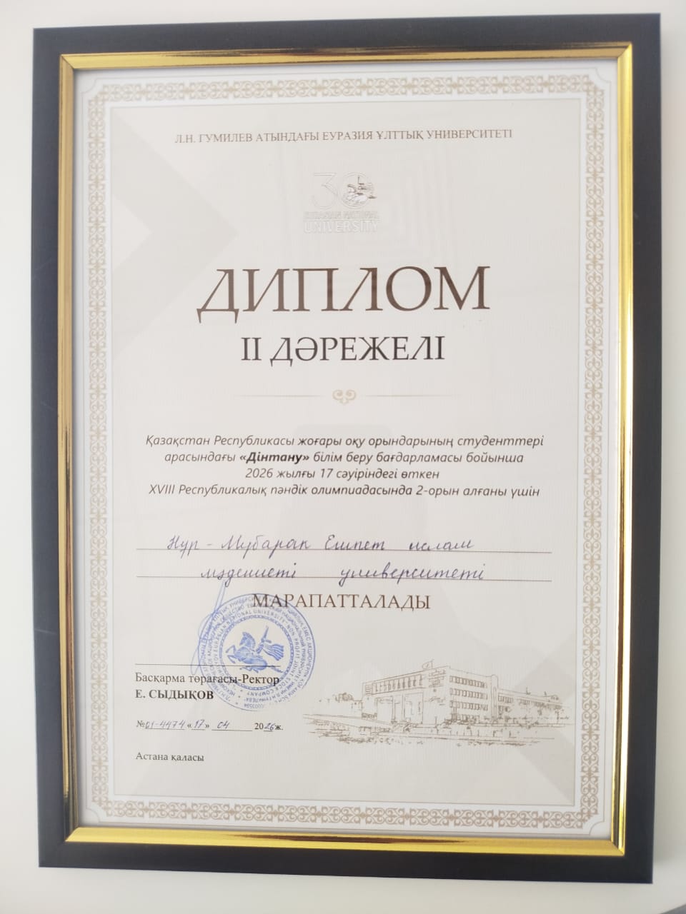 «Нұр-Мүбарак» Египет ислам мәдениеті университеті, Дінтану кафедрасының 4-курс студенті Әден Балжан мен 3-курс студенттері Жақсылық Нұртуған және Ашура Мерей «6В02202-Дінтану» білім беру бағдарламасы бойынша Астана қаласындағы Л.Гумилев атындағы Еуразия ұлттық университетінде өткен «Жасанды интеллект пен цифрландыру кезеңіндегі дін» атты республикалық пәндік олимпиадада топтық жарыс бойынша жүлделі 2 орынды жеңіп алды.