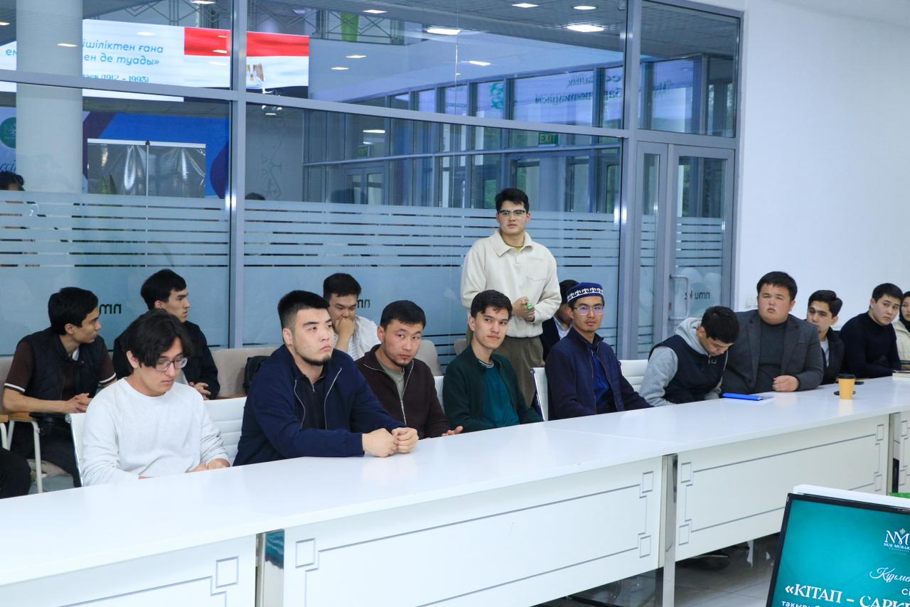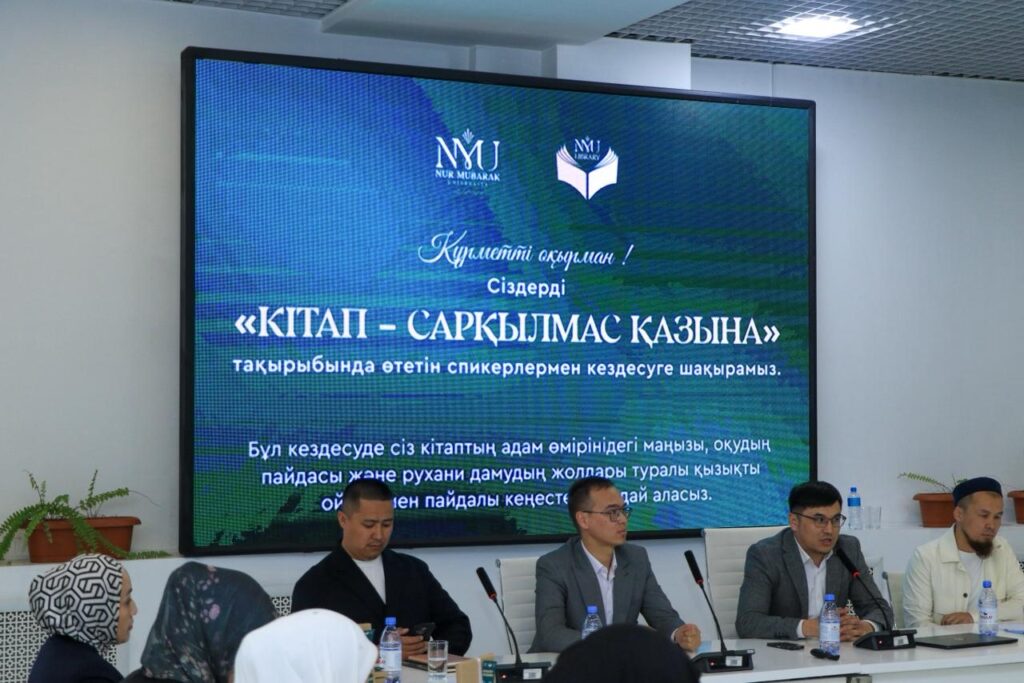 «Нұр-Мүбарак» Египет ислам мәдениеті университетінде ҚР Ұлттық кітап күні мен Кітапханашылар күніне орай қаламгер ұстаздардың қатысуымен келелі кездесу өтті. «Кітап – сарқылмас қазына» атты тақырыппен өрбіген жиында Мұрат Әбілқасымұлы, Ернар Есімқұлов, Бағлан Шежімбай және Сырым Шәкизада сынды спикерлер сөз сөйлеп, шәкірттерге кітап оқудың пайдасы мен артықшылығын насихаттады.